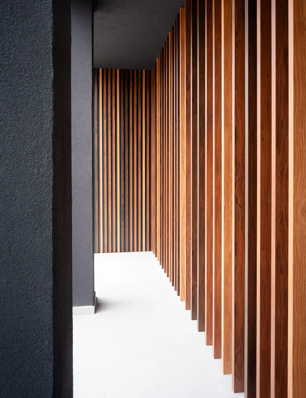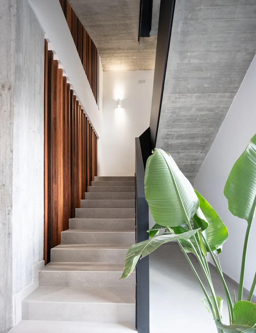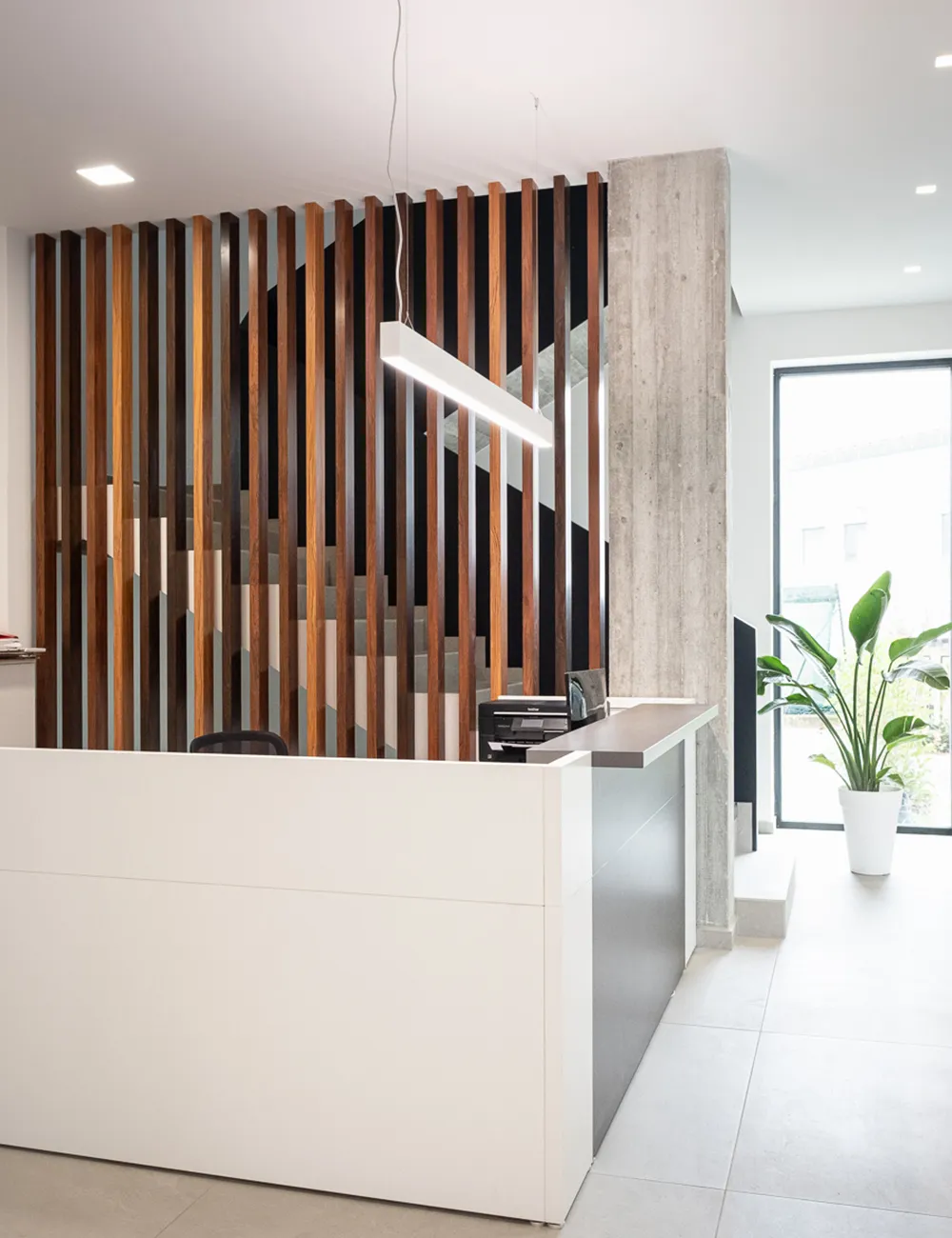 Inside, the same design logic is reflected in the common areas, particularly in the main staircase zone. Here, the battens become a visual and material connection element, transforming the parapet into an elegant and decorative screen that softens the raw materiality of exposed concrete and neutral surfaces. The result is a welcoming and dynamic environment where design and functionality coexist in balance — just as in the best examples of contemporary modern offices.