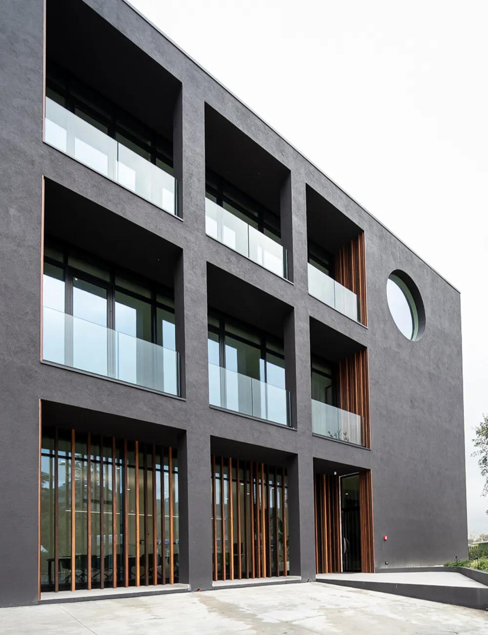 On the exterior, the battens define the compact volume of the building with an orderly vertical rhythm, interpreting the façade as a brise-soleil system. In addition to enhancing the architectural image, this solution contributes to the climatic comfort of the workspaces by modulating natural light and improving energy efficiency — an increasingly central aspect in the design of modern offices.