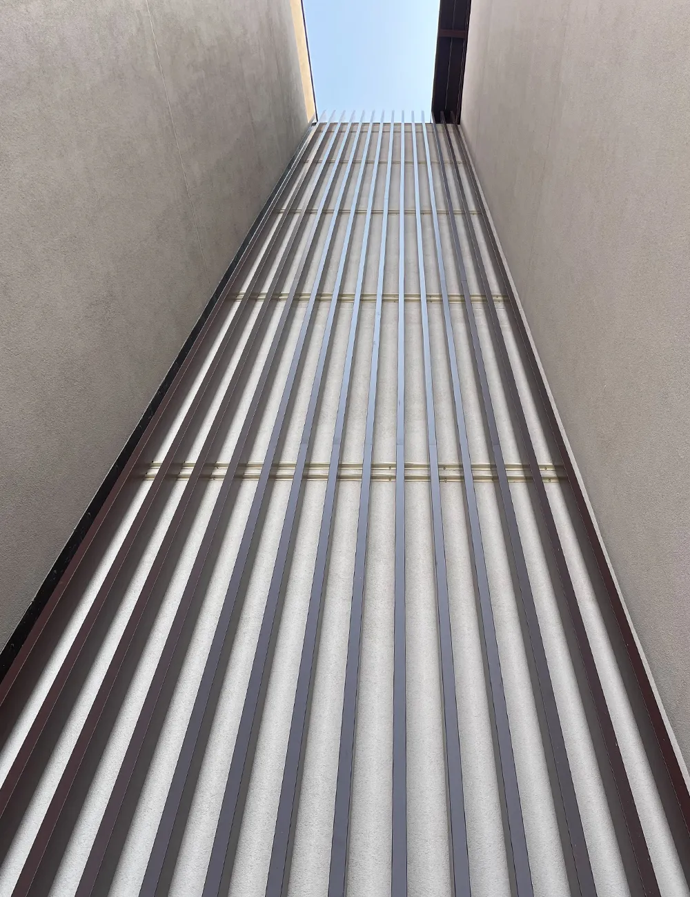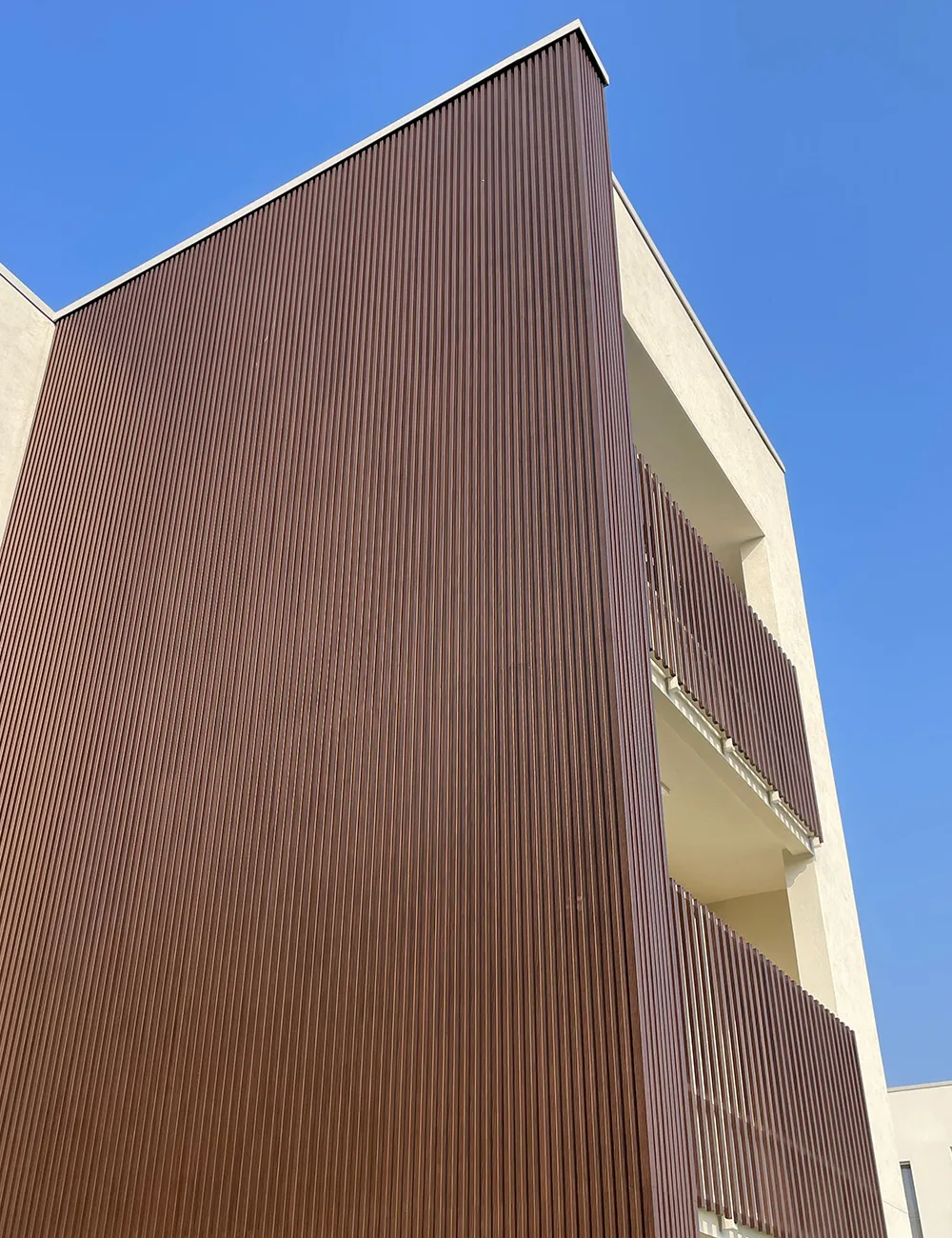 The BATTENS Light profiles in the Volcano Ash finish shape the main façade with an orderly rhythm and a texture that evokes the natural look of wood, while offering all the solidity and longevity of aluminum. The same material language is echoed in the parapets and privacy screens, made with ForMe Design profiles in different sections to ensure visual coherence and stylistic continuity.